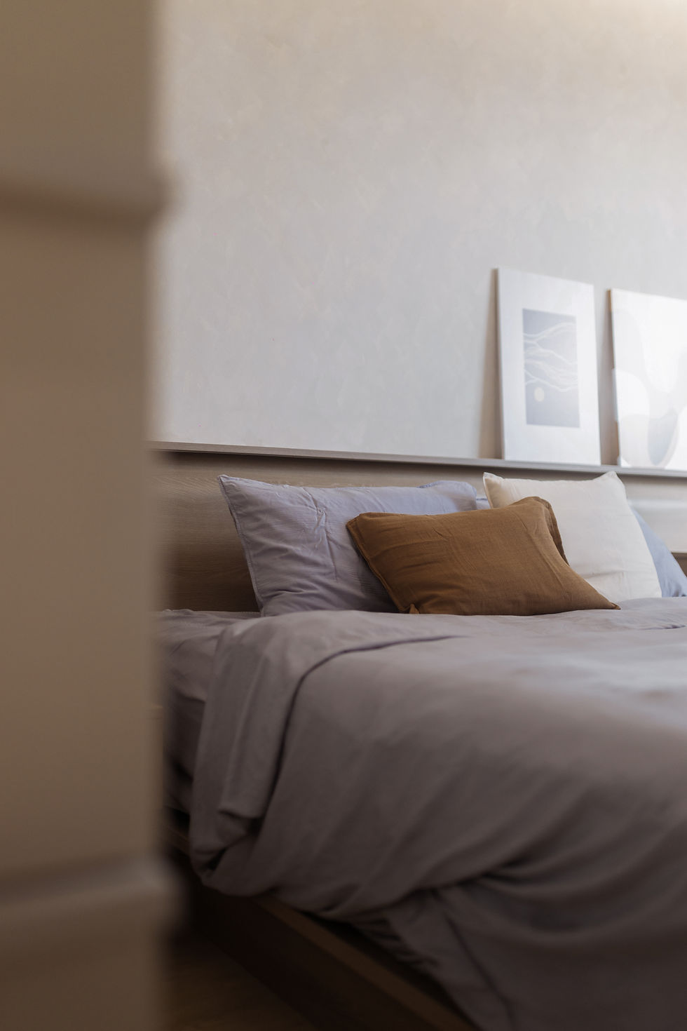 The master bedroom is designed as a tranquil retreat, incorporating a multi-functional desk that effortlessly transitions into a makeup dresser—catering to both work and personal routines. Built-in wardrobes and concealed storage maintain the clean aesthetic, while soft lighting enhances the restful ambiance.